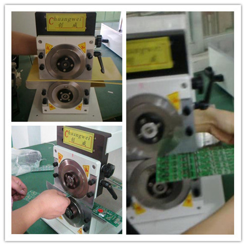 2、下圓刀旋轉速度由馬達驅動,放置PCB與兩上下圓刀之間,便會自動定位于V-CUT溝槽,進行運送與裁切。